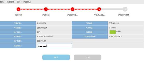2、输入转出份额,进入确认页面,输入交易密码,点击确认后,显示产品转出申请登记成功,之后可在"我的产品转让"中对该笔申请的日终撮合情况进行查询。流程同“产品转入”功能。