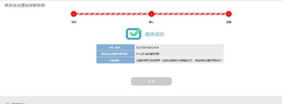 5、点击“确认”,则开通成功。设置当日即生效,卡或账户内活期存款金额达到5万元(含)以上时,系统自动将5万元及剩余资金中的1000元的整数倍部分生成7天或1天自动通知存款账户,不足1千元部分仍存在活期账户中。