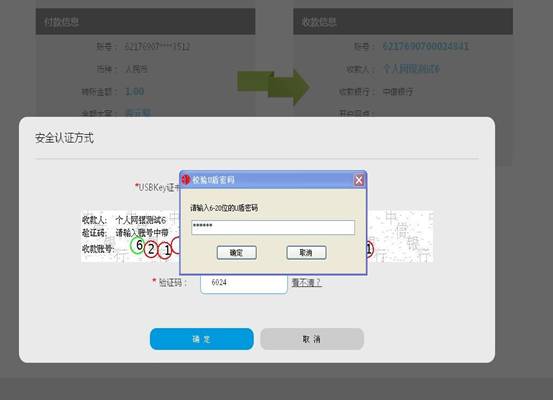 4.若选择安全认证方式为USBKEY,选择证书后输入验证码及U盾密码,提交后即转账成功。