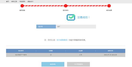 6.转账成功。可点击相应按钮进行交易明细查询、继续转账、结果打印操作。