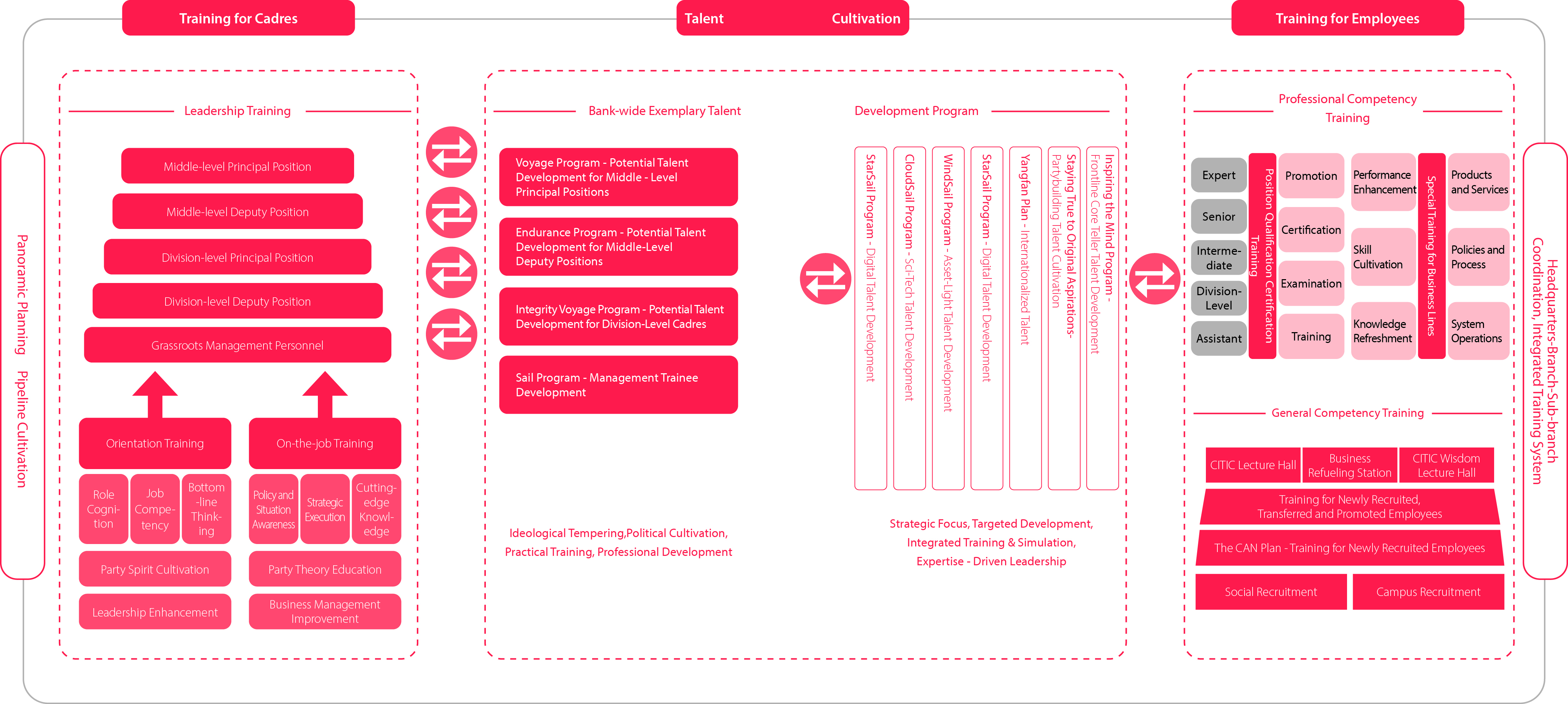 The Bank continuously develops a multi-tiered training system, including a leadership-focused “orientation and on-the-job” training framework for managers at all levels, and professional and general competency training programs to enhance the business capabilities of all employees. Building on this, the Bank intensifies talent cultivation through Bank-wide exemplary programs targeting cadres and specialists, ensuring alignment with organizational and individual development goals.