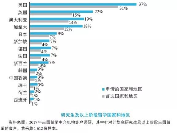从留学地区上看,不同于本科阶段留学生相对分散的选择,申请外研究生及以上阶段的学生更热衷于北美地区。2017年出国留学中介机构客户调研数据显示,以美国和加拿大为代表的北美地区以51% 的申请率稳居首位,且43% 的学生将其作为首选的留学地区,其次是欧洲。