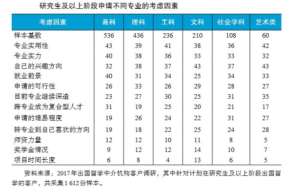 研究生及以上阶段申请不同专业存在多维度的考量因素。在研究生及以上阶段申请留学的学生希望在自己的专业领域进行深造,增加就业时的竞争力。因此学生更加青睐师资力量雄厚及硬件设施好的学校。高水平的师资力量可以让学生进一步接触到核心学术成果和前沿科研技术,从而提高学生的专业素养。